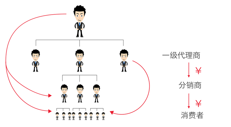三级分销是指品牌商可以发展三级分销商,每一级分销商均可往下发展两级分销商,期间产生的收益可按分销等级获得销售佣金。简而言之,A成为蓝菲红酒的代理商后,可向下发展B和C两级分销商,若C卖出了产品,那么三者可根据事先预定的等级分成制度获得佣金,C获取一级佣金,B为二级,A为三级,以一级佣金为最高等级。
