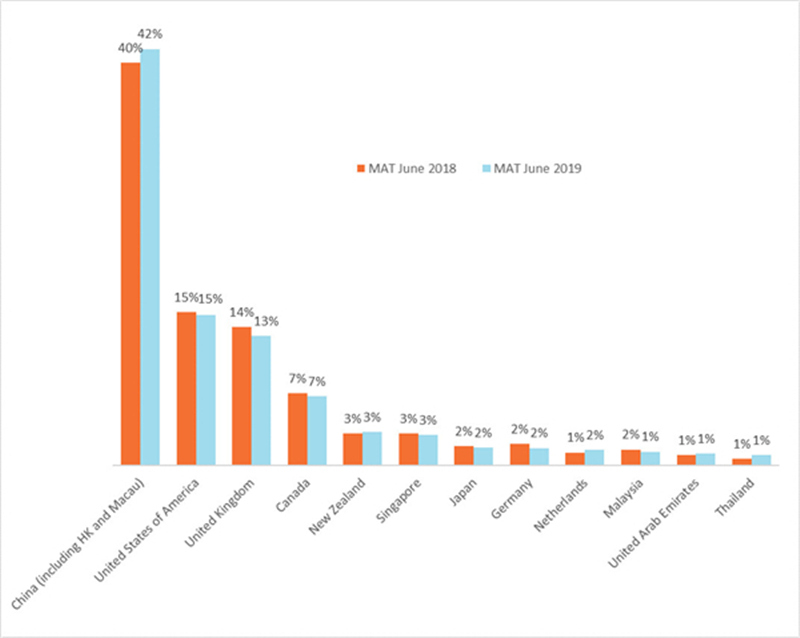 澳大利亚葡萄酒在中国表现非常良好。回顾2019年的前5个月,澳大利亚在进口额上成为中国大陆排名第一的葡萄酒进口来源国。同时,在全球葡萄酒进口市场总量下挫22%的情况下,澳大利亚葡萄酒在中国大陆的表现依然强势,其市场份额相比于2015年增长了13%,达到了进口总量的24%。澳大利亚巩固了其作为中国市场优质葡萄酒主要供应商的显赫地位。