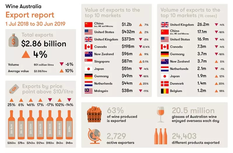 根据澳大利亚葡萄酒管理局(Wine Australia)公布的数据,2019年前5个月,澳大利亚出口中国大陆的葡萄酒总价值首次超越法国,成为中国进口葡萄酒的第一大来源国。