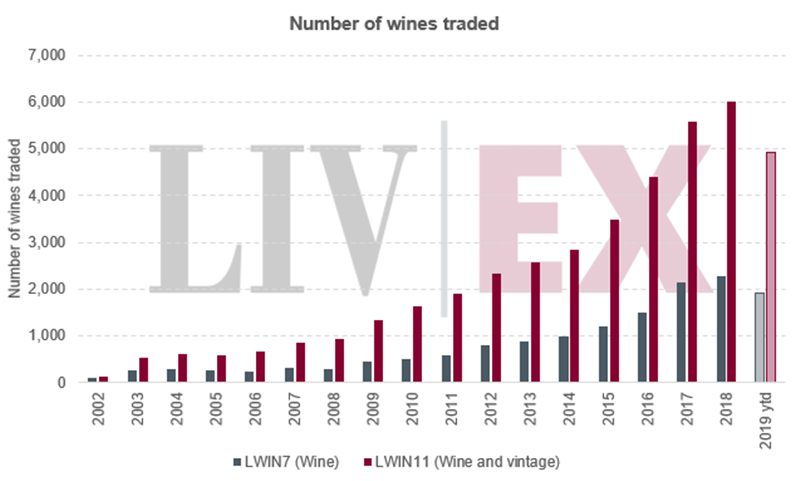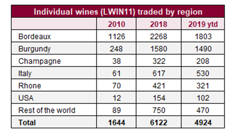 本年至今,已有4924款不同的葡萄酒(包括不同年份)出现交易。它们来自多个不同酒区,包括英国、中国和黎巴嫩;尽管这些国家的交易数量不多。