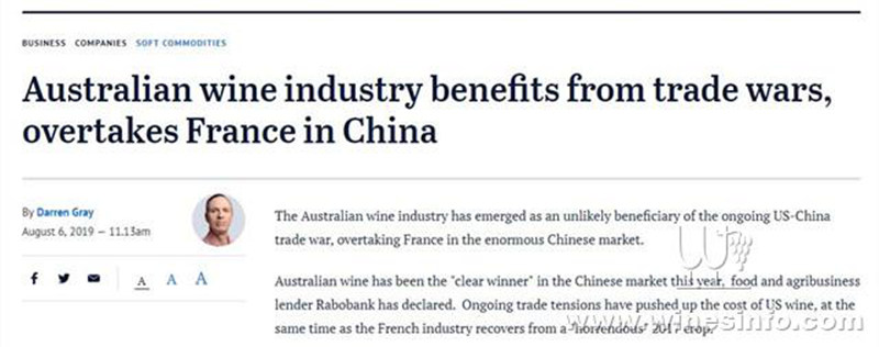 2018年澳洲对中国葡萄酒出口量上涨19.8%,且在2019年的前4个月中更是上涨了25.7%。(网页截图/《时代报》)