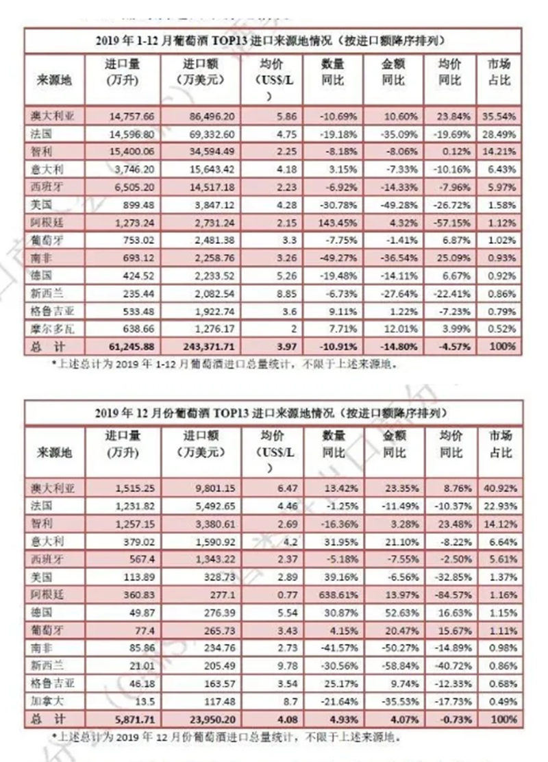 法国葡萄酒被澳洲迅速超过出乎多数法国厂商的预期。多数法国葡萄酒企业在2019年采取了降价的措施,可以看出其总金额出现了35.09%的断崖式下滑,均价降低了19.69%。法国葡萄酒在中国市场占比下滑是多种因素造成的,多年持续涨价是一个原因,但更重要的是品牌化力量不足,头部品牌的数量过少。但是,法国酒在中国的市场基础还是很雄厚,期待2020年能在品牌短板上有所改善。