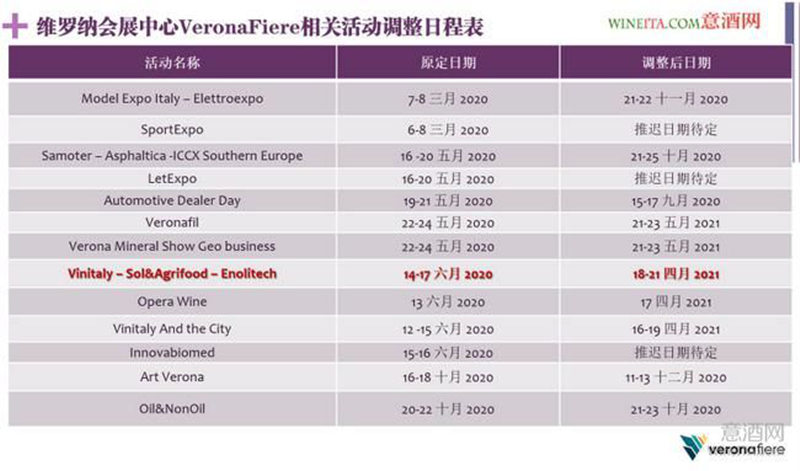 2月26日,意大利维罗纳会展公司曾宣布本届VinItaly将如期于2020年4月19日至22日在维罗纳(Verona)市举行。3月3日晚间,意大利维罗纳会展公司(Veronafiere)宣布更改决定,将本届VinItaly延至2020年6月14-17日举行。20天之后,维罗纳会展公司再次宣布,确定将本届VinItaly延期至2021年。