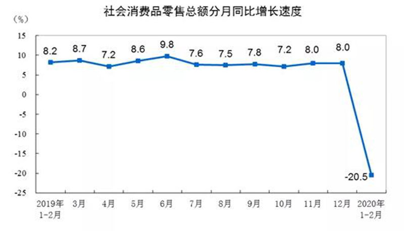 国内自1月份开始受到疫情冲击,生产消费几乎冰冻。1-2月份,社会消费品零售总额52130亿元,同比名义下降20.5%(扣除价格因素实际下降23.7%,以下除特殊说明外均为名义增长),较去年12月大幅下滑28.5和28.2个百分点,其中仅粮油食品、饮料、药品等少数维持正增长。(数据来源:国家统计局)