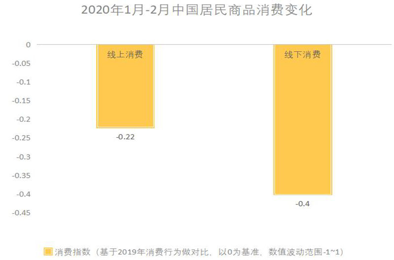 疫情期间,实际消费指数均呈下滑态势,但线上消费依旧可观。对比2019年,2020年我国消费者整体线上消费指数为-0.22,线下消费指数为-0.40(数据来源:艾瑞咨询)。