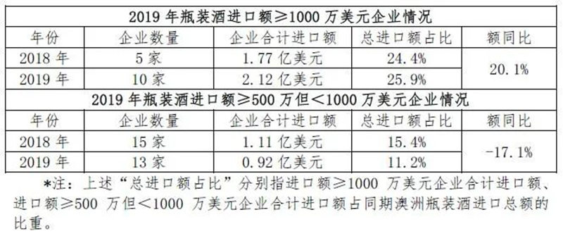 近两年,头部企业对澳洲酒的持续加码对进口葡萄酒市场格局起到了头雁效应。澳洲瓶装酒进口头部企业(指进口额≥500万美元以上的企业)队伍有所壮大,且进口额呈正向增长(5.6%):其中,2019年进口额≥1000万美元的10家企业中9家实现同比增长,仅1家同比下降;进口额≥500万美元的13家企业中9家实现同比增长,4家同比下降。