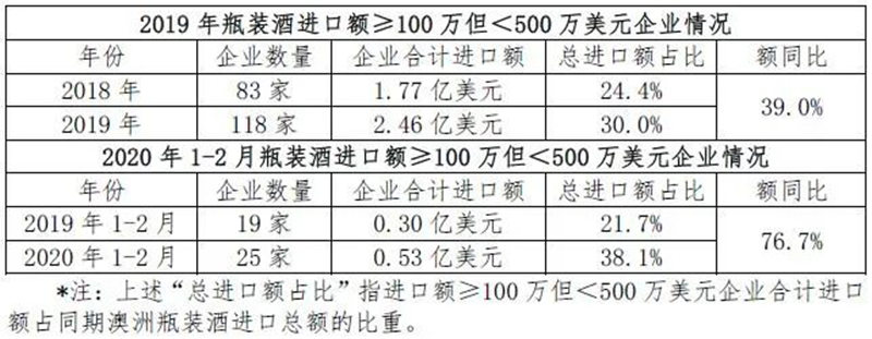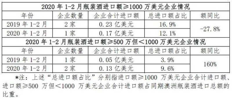 今年1-2月,尽管疫情对行业有一定冲击,但澳洲瓶装酒进口头部企业基本稳住阵脚。虽然进口额≥1000万美元的企业仅1家,少于去年同期,但其进口额同比增长近30%;而进口额≥500万但小于1000万美元的企业有2家,数量增加,其中,1家进口额实现倍数增长,1家为新的行业进入者。