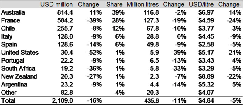 根据全球贸易数据库(Global Trade Atlas)的数据显示,截至 2020 年 2 月底的 12 个月,中国的葡萄酒进口总额下降了 17%(美元),进口量下降了 14%。这一下降主要是受到法国瓶装酒进口额下降 39%的影响(见表 1)。而瓶装澳大利亚葡萄酒的进口额则上升了 11%,澳大利亚也成为唯一一个在瓶装葡萄酒进口额上保持上升趋势的进口来源国。