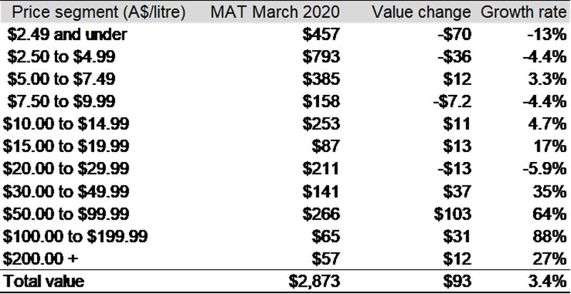 截至 2020 年 3 月底的 12 个月中,出口额最大的降幅主要出现在价格低于 5 澳元/升(离岸价)的澳大利亚葡萄酒。相反,价格高于 10 澳元/升(离岸价)的葡萄酒出口额则增长了 22%至 10.8 亿澳元,特别是价格区间在 50 至 99.99 澳元之间的葡萄酒成为驱动澳大利亚葡萄酒出口额增长的主力军。