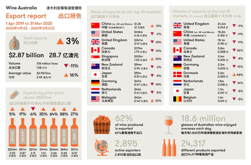 截至 2020 年 3 月底的 12 个月中,澳大利亚葡萄酒的出口总额持续增长。不过,澳大利亚葡萄酒管理局也报告称新型冠状病毒对澳大利亚葡萄酒出口的影响还未全面显现。