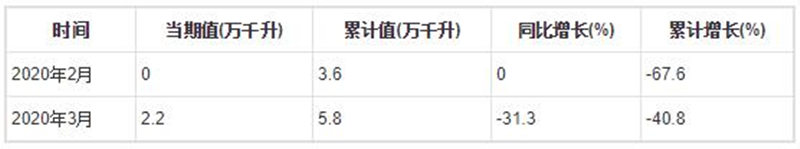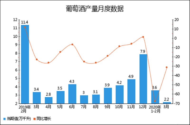 2020年3月全国葡萄酒产量为2.2万千升,累计值为5.8万千升,同比下降31.3%,累计下降40.8%。