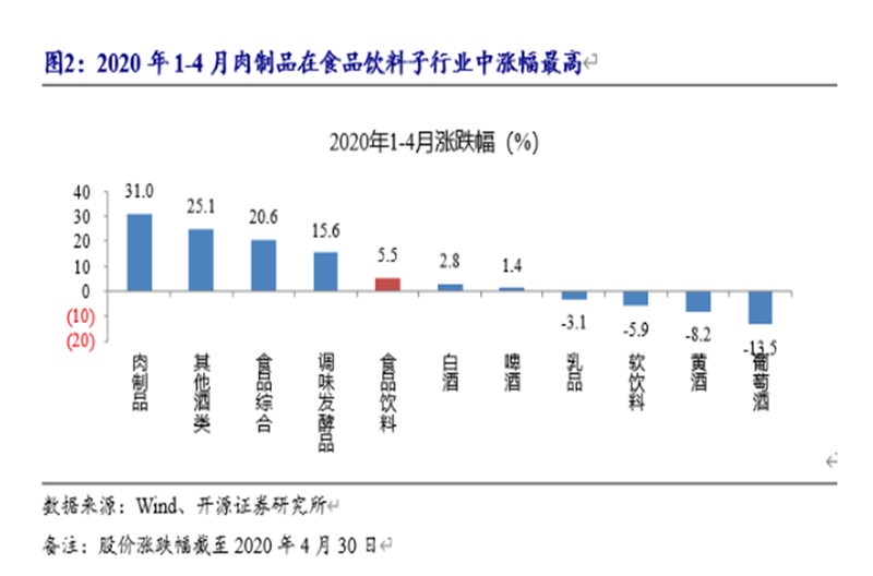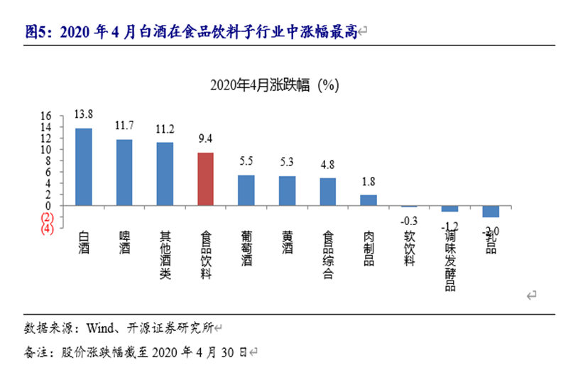 尤其是进入2020年4月份以来,食品饮料板块上涨9.4%,其中重要原因是:国内疫情控制得当,消费回暖,以白酒为代表的可选消费重新获得市场青睐,涨幅领跑各大品类,为13.8%,而葡萄酒销售亦有上涨趋势,为5.5%。