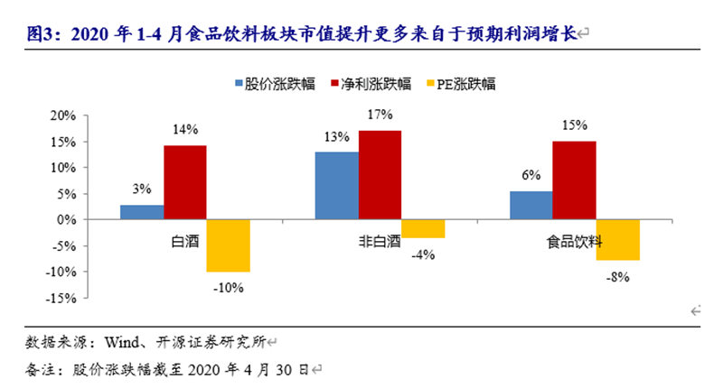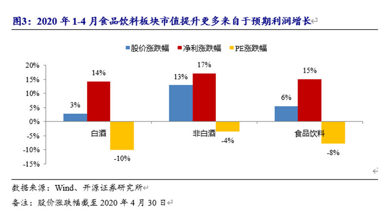 2020年1-4月食品饮料板块上涨5.5%,在一级子行业中排名第三。涨幅分解来看,预计2020年净利增长15%。