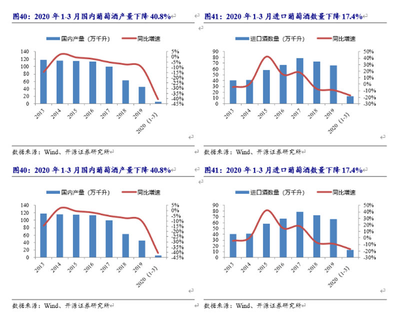 观察行业数据,2020年1-3月国内葡萄酒产量同比降40.8%,降幅较年初扩大;进口酒量同比下滑17.4%,同样加速下滑。