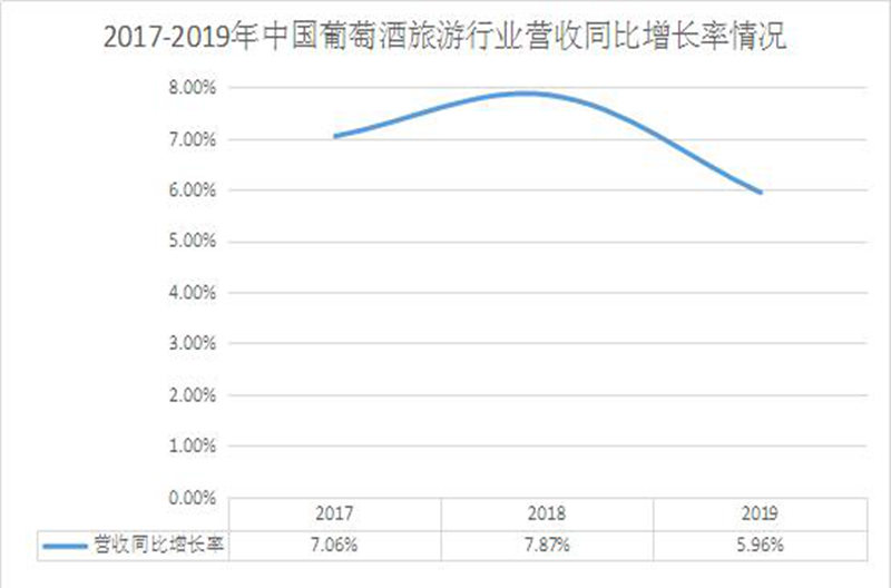 据不完全统计,2019年中国葡萄酒旅游行业营收同比增长率约为5.96%,在旅游行业中,处于上游水平,行业发展能力较良。