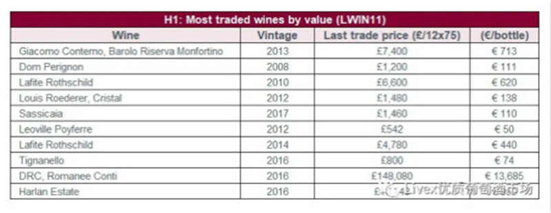 Giacomo Conterno, Barolo Riserva Monfortino 2013年成为上半年交易总值最高的葡萄酒。目前为止,意大利的交易份额为10.3%,而此酒则占了该酒区14.6%交易。2013年份(去年年底发布)取得Antonio Galloni (Vinous) 99分。2014年份(AG 100)于本月初上市。目前的出价为£8,400(760欧元 / 每瓶)。