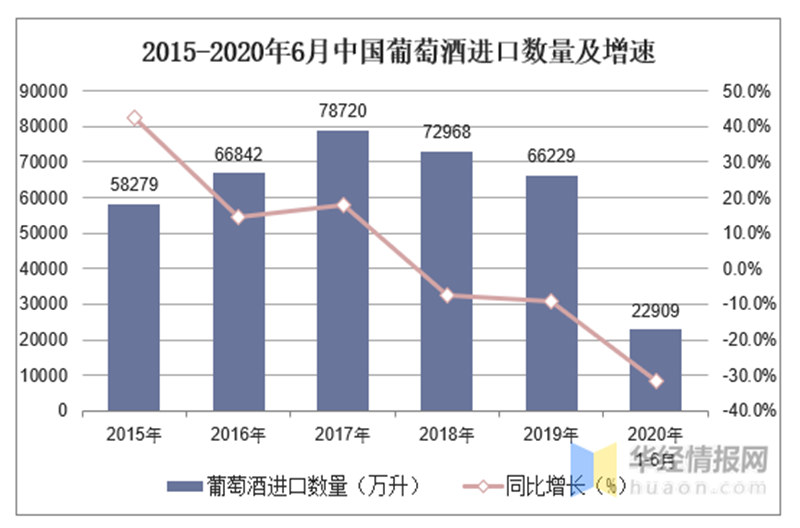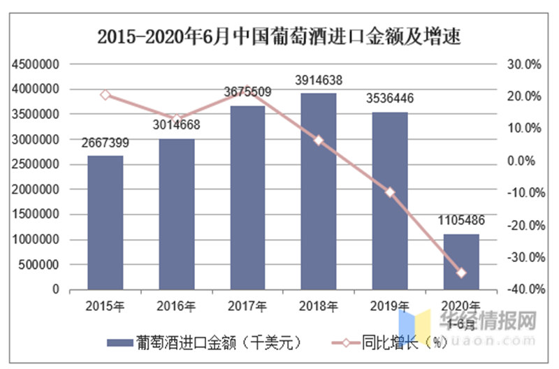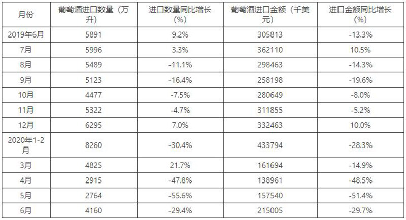 2020年6月中国葡萄酒进口数量为4160万升,同比下降29.4%;进口金额为215005千美元,同比下降29.7%。