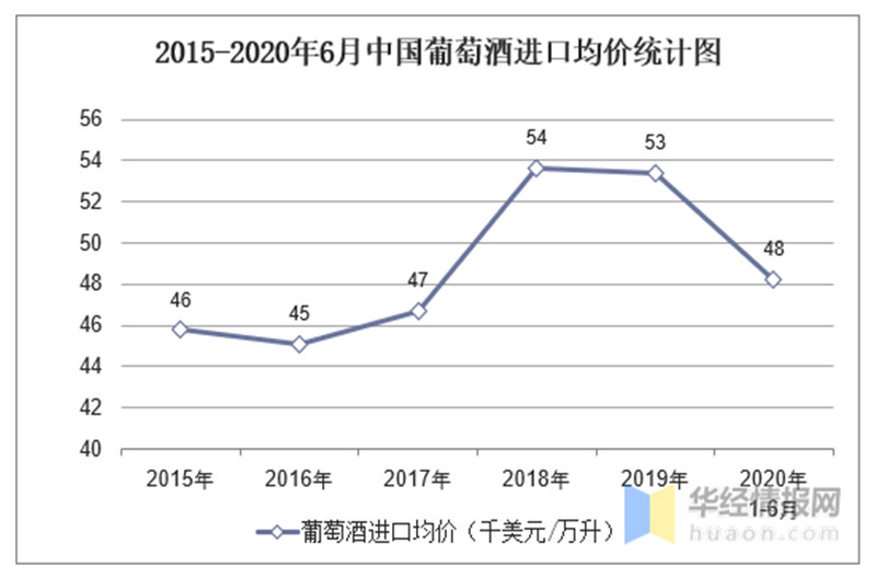 华经产业研究院数据显示:2020年1-6月中国葡萄酒进口数量为22909万升,相比上年同期减少了10638.1万升,降幅为31.7%;进口金额为1105486千美元,相比上年同期减少了588716千美元,降幅为34.8%;2020年1-6月中国葡萄酒进口均价为48.26千美元/万升。