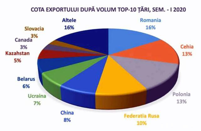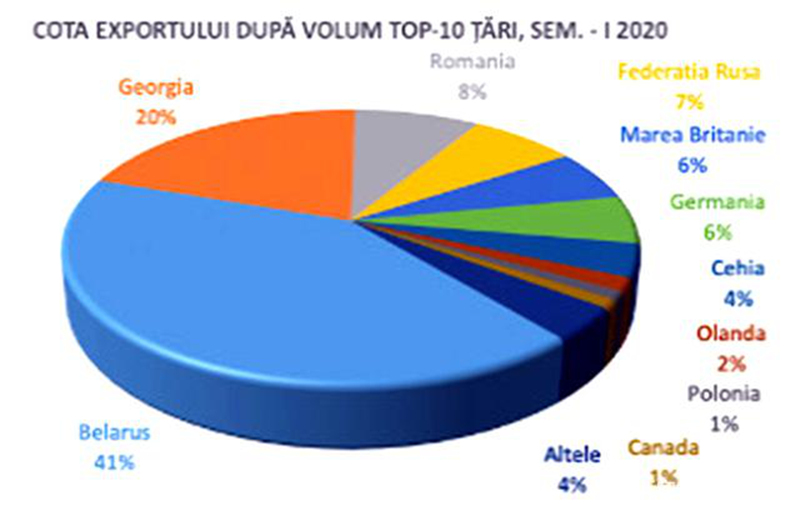 摩尔多瓦向56个国家和地区的出口总额为12.478亿列伊, 比2019年前6个月下降了5.7%(即减少了7470万列伊)。