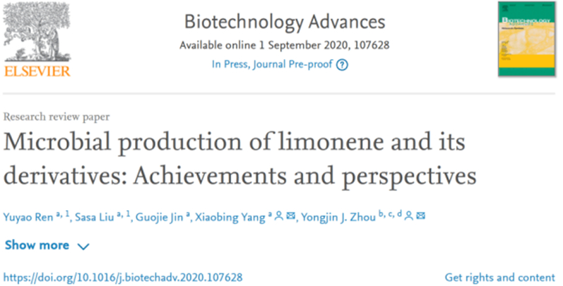 近日,葡萄酒学院杨晓兵副教授团队在著名生物技术学术期刊《Biotechnology Advances》(IF=10.744)发表了题为 “Microbial production of limonene and its derivatives: Achievements and perspectives” 的综述文章,系统总结了近年来利用代谢工程和合成生物学策略合成柠檬烯及其衍生物研究进展。西北农林科技大学为第一署名单位,中科院大连化学物理研究所为合作单位;16级本科生任毓瑶和18级博士研究生刘洒洒为共同第一作者,我校杨晓兵副教授与大连化物所周雍进研究员为共同通讯作者,我校靳国杰副教授参与了该综述的撰写工作。《Biotechnology Advances》是生物技术领域顶级国际期刊,在105种应用微生物与生物技术相关的杂志中排名第3,该杂志全年收录文章在100篇左右,2019年H指数161。