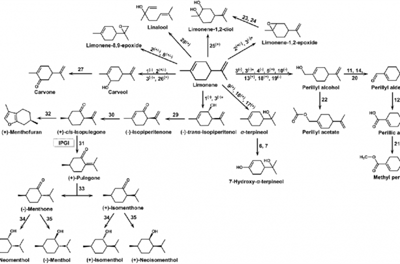 葡萄与葡萄酒中单萜类化合物能够赋予葡萄与葡萄酒浓郁独特的芳香,如玫瑰、桂花、凤梨及蜂蜜等香味。柠檬烯是葡萄与葡萄酒中天然存在的具有代表性的单帖香气物质之一,在微生物作用下能够衍生出数十种单萜类化合物。阐释柠檬烯生物合成途径及衍生化过程有助于理解葡萄与葡萄酒萜烯类香气物质的形成机制,为利用代谢工程进行葡萄育种研究,以及采用工程菌调控葡萄酒品种香气物质组成开展前瞻性研究提供理论依据。此外,利用合成生物学和代谢工程策略构建高效柠檬烯及其衍生物微生物细胞工厂能够为葡萄园废弃物高值化再利用,实现葡萄酒产业提质增效提供新思路。