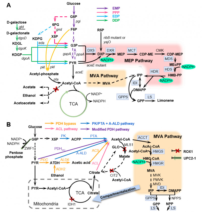 杨晓兵副教授团队长期致力于利用代谢工程和合成生物学策略构建高价值化合物细胞工厂的研究工作。目前,已利用代谢工程策略成功改造圆红冬孢酵母(Rhodosporidium toruloides)构建了柠檬烯等单帖化合物、羟基化脂肪酸、氨基酸衍生物的细胞工厂,其中柠檬烯微生物合成相关研究工作获得陕西省面上基金(2020JM177)、学校科研启动基金、国家级科创等支持,指导2016本科生任毓瑶毕业论文获得校级毕业论文。该综述介绍了微生物合成柠檬烯及其衍生物面临的机遇与挑战,详细阐述了异戊二烯途径多样性、代谢路径关键酶的发掘与表征、宿主细胞代谢路径的理性调控、辅因子平衡、柠檬烯及其衍生物生物毒性的解除及提升宿主微生物鲁棒性的策略等内容。本综述详尽讨论了大肠杆菌、酿酒酵母、蓝细菌和产油酵母等生产平台菌株的优势与不足,为系统地理性改造微生物代谢网络构建单帖细胞工厂提供了科学参考。
